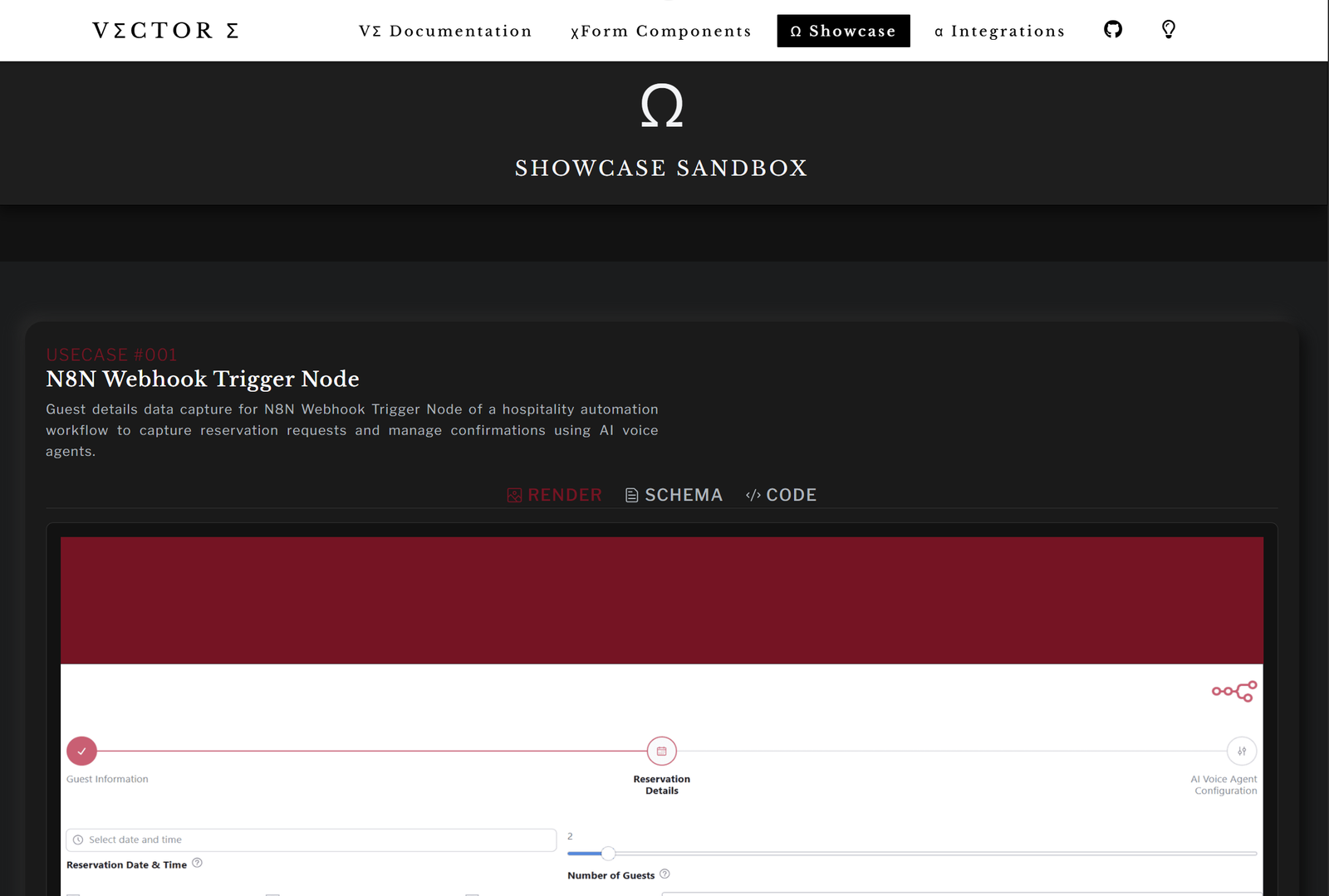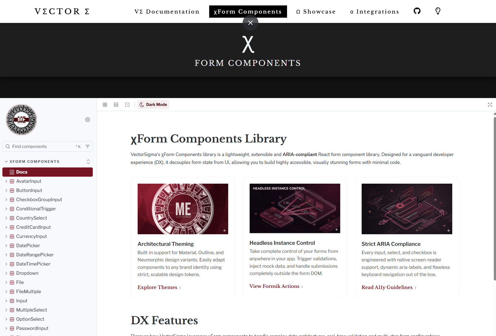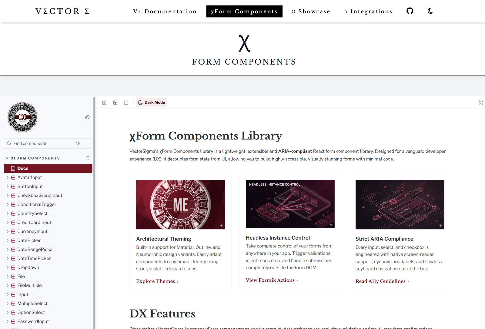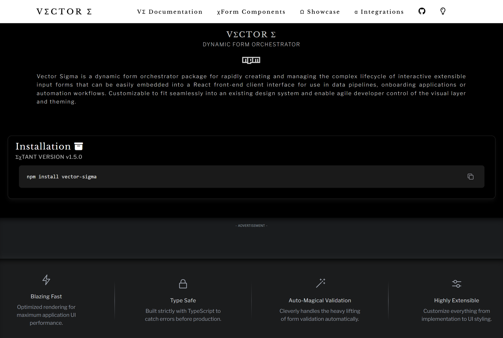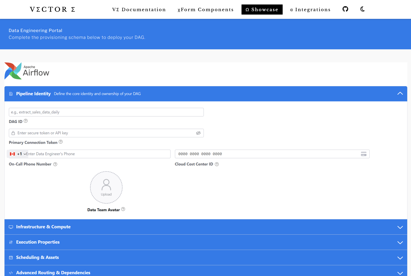 Vector Sigma (VΣ) is a dynamic form orchestrator package for rapidly creating and managing the complex lifecycle of interactive extensible input forms. Rendered xForms can be easily embedded into a React front-end client interface for use in data pipelines, onboarding applications or automation workflows. RadixUI Theming options provide a developer-friendly interface to seamlessly blend a VΣ form instance into an existing design system, enabling agile control of the visual layer.